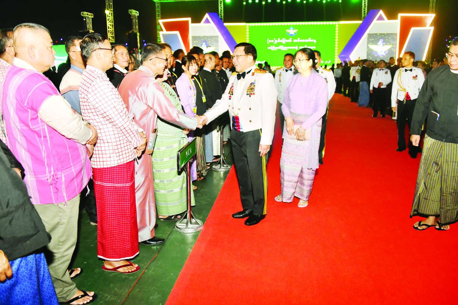 ထို့နောက် နိုင်ငံတော်လုံခြုံရေးနှင့်အေးချမ်းသာယာရေးကော်မရှင်ဥက္ကဋ္ဌ တပ်မတော်ကာကွယ်ရေးဦးစီးချုပ် ဗိုလ်ချုပ်မှူးကြီး မင်းအောင်လှိုင်နှင့် ဇနီးဒေါ်ကြူကြူလှတို့သည် (၈၁)နှစ်မြောက် တပ်မတော်နေ့အထိမ်းအမှတ် ဂုဏ်ပြုညစာစားပွဲသို့ တက်ရောက်လာကြသည့် ကော်မရှင်ဒုတိယဥက္ကဋ္ဌ ဒုတိယတပ်မတော်ကာကွယ်ရေးဦးစီးချုပ် ဒုတိယဗိုလ်ချုပ်မှူးကြီး စိုးဝင်း၊ ကော်မရှင်အတွင်းရေးမှူး၊ ကာကွယ်ရေးဦးစီးချုပ်(ကြည်း) ဗိုလ်ချုပ်ကြီး ရဲဝင်းဦးနှင့် ဇနီး၊ ကော်မရှင်အဖွဲ့ဝင် ညှိနှိုင်းကွပ်ကဲရေးမှူး (ကြည်း၊ ရေ၊ လေ) ဗိုလ်ချုပ်ကြီး ကျော်စွာလင်းနှင့်ဇနီး ကာကွယ်ရေးဦးစီးချုပ်(ရေ) ဗိုလ်ချုပ်ကြီးထိန်ဝင်းနှင့်ဇနီး၊