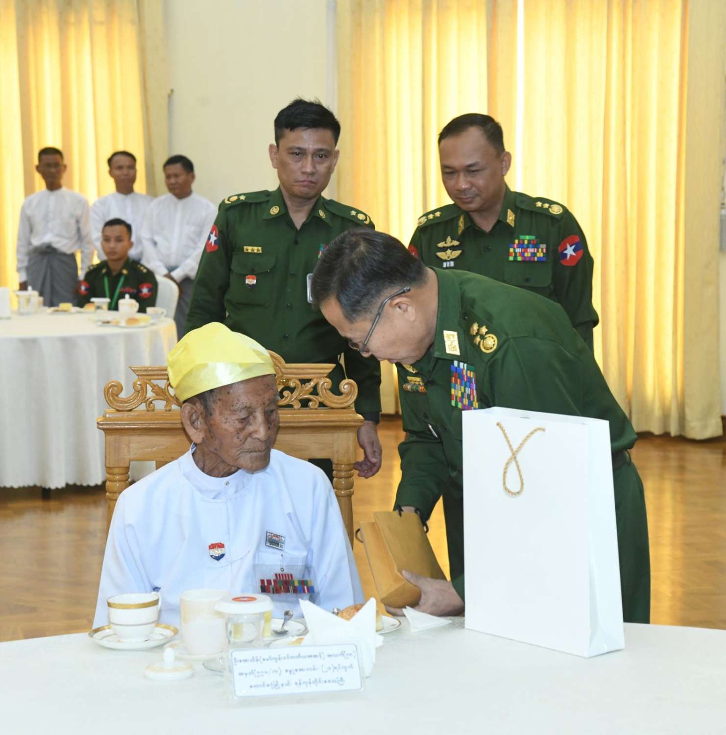 (၈၁) နှစ်မြောက် တပ်မတော်နေ့စစ်ရေးပြအခမ်းအနားသို့ တက်ရောက်ကြမည့် လွတ်လပ်ရေးမော်ကွန်းဝင်ပုဂ္ဂိုလ် ဒုတိယအဆင့် ၁ ဦးနှင့် တတိယအဆင့် ၂ ဦး စုစုပေါင်း ၃ ဦးတို့အား နိုင်ငံတော်လုံခြုံရေးနှင့် အေးချမ်းသာယာရေးကော်မရှင် ဒုတိယဥက္ကဋ္ဌ ဒုတိယတပ်မတော်ကာကွယ်ရေးဦးစီးချုပ် ဒုတိယဗိုလ်ချုပ်မှူးကြီး စိုးဝင်းက ယနေ့ နံနက်ပိုင်းတွင် နေပြည်တော်ရှိ ဘုရင့်နောင်ရိပ်သာ ဧည့်ခန်းမဆောင်၌ လက်ဘက်ရည်ဝိုင်းဖြင့် တည်ခင်းဧည့်ခံ၍ ဂါရဝပြုတွေ့ဆုံသည်။