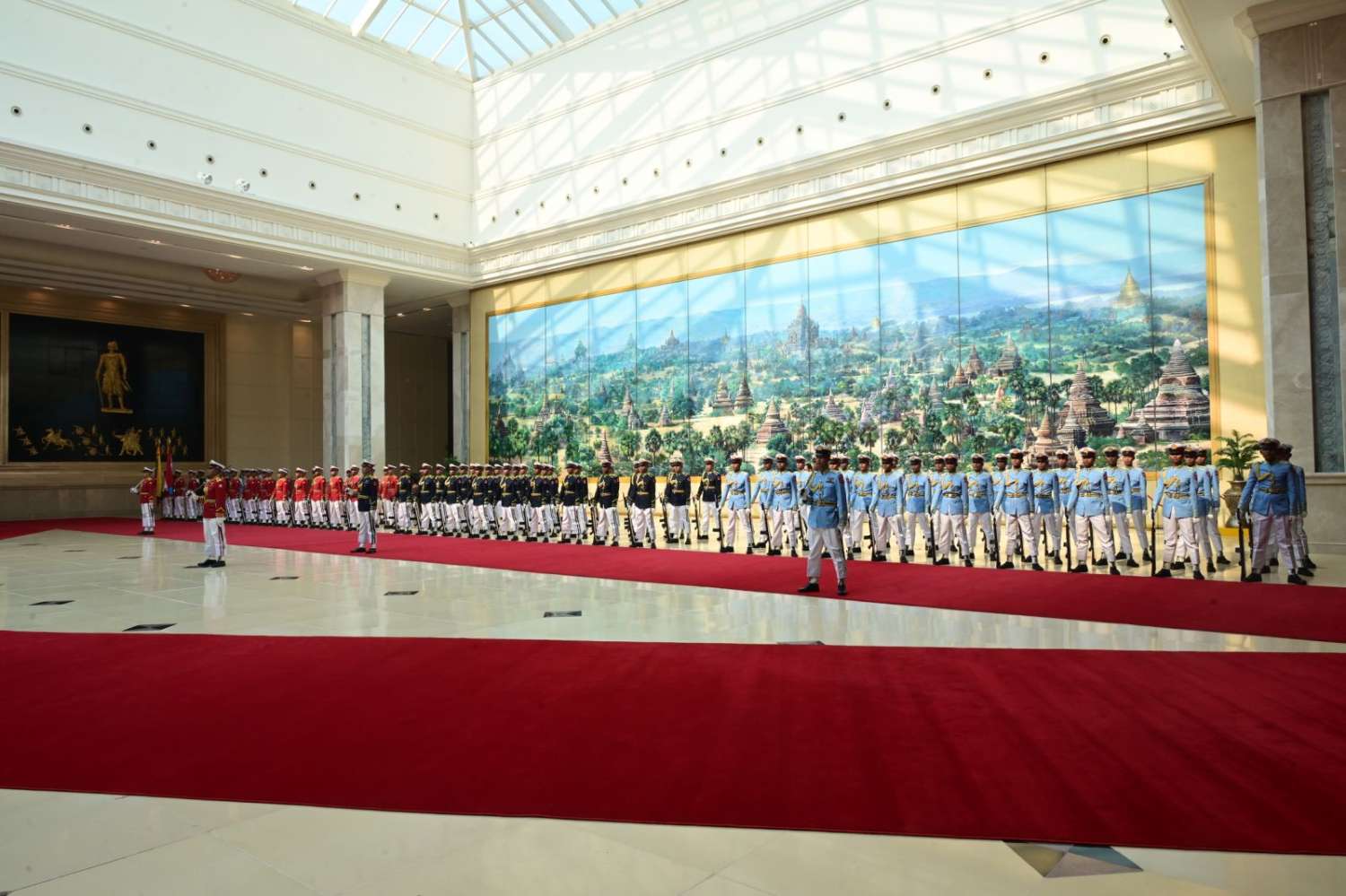 ထို့နောက် လက်ရှိမြန်မာ့တပ်မတော်၏ တပ်မတော်ကာကွယ်ရေးဦးစီးချုပ် တာဝန်ထမ်းဆောင်လျက်ရှိသည့် ဗိုလ်ချုပ်မှူးကြီး သတိုးမဟာသရေစည်သူ သတိုးသီရိသုဓမ္မ မင်းအောင်လှိုင်သည် ဂုဏ်ပြုတပ်ခွဲအား စစ်ဆေးသည်။