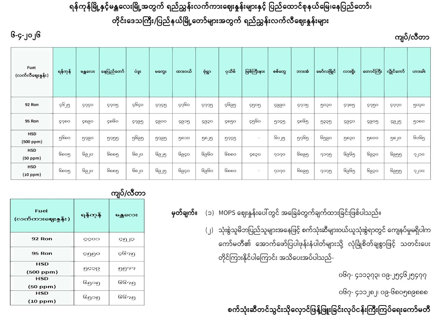 ရန်ကုန်မြို့နှင့် မန္တလေးမြို့အတွက် ရည်ညွှန်းလက်ကားဈေးနှုန်းများနှင့် ပြည်ထောင်စုနယ်မြေ နေပြည်တော်၊ တိုင်းဒေသကြီး/ပြည်နယ် မြို့တော်များအတွက် ရည်ညွှန်းလက်လီဈေးနှုန်းများ 04/06/2026