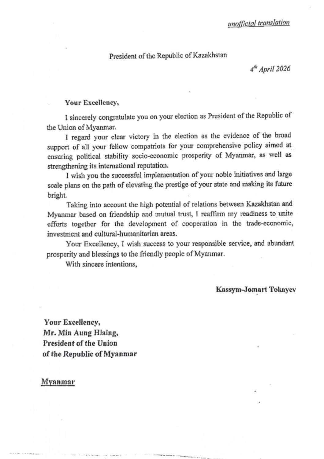 ပြည်ထောင်စုသမ္မတမြန်မာနိုင်ငံတော်၊ ရွေးကောက်တင်မြှောက်ခြင်းခံရသော သမ္မတ၊ နိုင်ငံတော်လုံခြုံရေးနှင့်အေးချမ်းသာယာရေးကော်မရှင်ဥက္ကဋ္ဌ ဗိုလ်ချုပ်မှူးကြီး မင်းအောင်လှိုင်ထံသို့ ကာဇက်စတန်သမ္မတနိုင်ငံသမ္မတ မစ္စတာ ကာစင်ဂျိုမတ် တိုခါယက်ဗ်ထံမှ ဝမ်းမြောက်ကြောင်းသဝဏ်လွှာ ပေးပို့