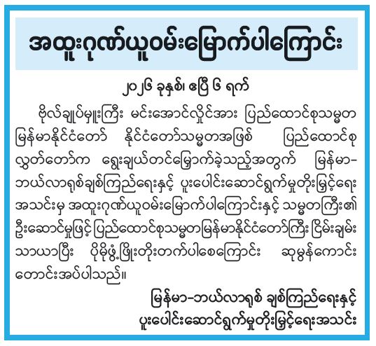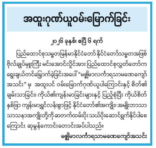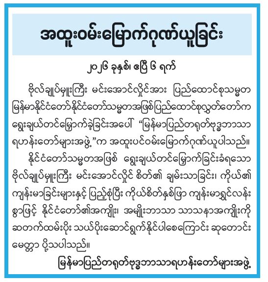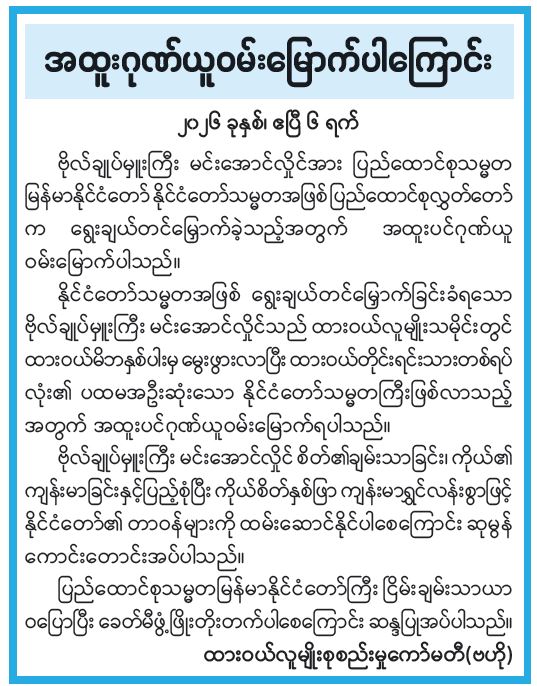 အဆိုပါထုတ်ပြန်ကြေညာချက်များတွင် ပြည်ထောင်စုသမ္မတမြန်မာနိုင်ငံတော် နိုင်ငံတော်သမ္မတအဖြစ် ဗိုလ်ချုပ်မှူးကြီး မင်းအောင်လှိုင်အား ပြည်ထောင်စုလွှတ်တော်က ရွေးချယ်တင်မြှောက်ခဲ့သည့်အတွက် အထူးဂုဏ်ယူဝမ်းမြောက်မိပါကြောင်း၊ မြန်မာနိုင်ငံတော်ကြီး ငြိမ်းချမ်းသာယာဝပြောပြီး ခေတ်မီဖွံ့ဖြိုးတိုးတက်သော နိုင်ငံတော်ဖြစ်အောင် ဆောင်ရွက်နိုင်ပါစေကြောင်း၊ ကိုယ်စိတ်နှစ်ဖြာကျန်းမာ၊ ချမ်းသာစွာဖြင့် ပြည်သူများ၏ အကျိုးအတွက် နိုင်ငံ့တာဝန်များကို ထမ်းဆောင်နိုင်ပါစေကြောင်း၊ ဘာသာအကျိုး၊ သာသနာအကျိုး၊ နိုင်ငံအကျိုးကို ဆတက်ထမ်းပိုး သယ်ပိုးထမ်းရွက်နိုင်ပါစေကြောင်း၊ သမ္မတကြီး၏ ဦးဆောင်မှုဖြင့် ပြည်ထောင်စုသမ္မတမြန်မာနိုင်ငံတော်ကြီး ငြိမ်းချမ်းသာယာပြီး ပိုမိုစည်ပင်ဖွံ့ဖြိုးတိုးတက်ပါစေကြောင်း၊ နိုင်ငံတော်ကို တည်ငြိမ်အေးချမ်းစေပြီး ပြည်သူအများ ချမ်းသာကြွယ်ဝကာ နိုင်ငံ့စီးပွားထွန်းကားလျက် အခြေအနေသစ်များနှင့် အသစ်သောအသွင်ကူးပြောင်းမှုများဖြင့် ကောင်းမွန်ပြည့်စုံပါစေကြောင်း စသည်ဖြင့် ပါရှိကြောင်း သိရှိရသည်။