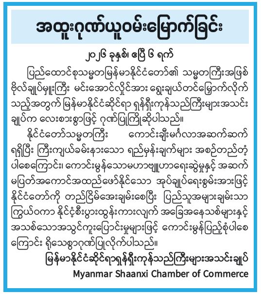 ၂၀၂၆ ခုနှစ်၊ ဧပြီလ ၃ ရက်တွင် ကျင်းပသည့် နိုင်ငံတော်သမ္မတရွေးချယ်တင်မြှောက်ပွဲ၌ ပြည်ထောင်စုလွှတ်တော်ကိုယ်စားလှယ်အားလုံးပါဝင်သော နိုင်ငံတော်သမ္မတရွေးချယ်တင်မြှောက်ရေးအဖွဲ့က ရွေးကောက်ခံ ပြည်သူ့လွှတ်တော်ကိုယ်စားလှယ်များအစုအဖွဲ့မှ ဒုတိယသမ္မတအဖြစ် ရွေးချယ်တင်မြှောက်ထားသော ဗိုလ်ချုပ်မှူးကြီး မင်းအောင်လှိုင်အား နိုင်ငံတော်သမ္မတအဖြစ် ရွေးချယ်တင်မြှောက်ခြင်းခံရသည့်အတွက် လောကချမ်းသာ အဘယလာဘမုနိရုပ်ပွားတော်မြတ်ကြီး (ကျောက်တော်ကြီးဘုရား) ဘဏ္ဍာတော်ထိန်းဂေါပကအဖွဲ့၊ မြန်မာနိုင်ငံလုံးဆိုင်ရာ MSME Cluster ဖိနပ်လုပ်ငန်းရှင်များဗဟိုအဖွဲ့ချုပ်၊ မြန်မာနိုင်ငံဆိုင်ရာ ရှန်ရှီးကုန်သည်ကြီးများအသင်းချုပ်၊ မြန်မာ-ဘယ်လာရုစ် ချစ်ကြည်ရေးနှင့် ပူးပေါင်းဆောင်ရွက်မှုတိုးမြှင့်ရေးအသင်း၊ မြန်မာနိုင်ငံတိုင်းရင်းဆေးဆရာအသင်း၊ မြန်မာပြည် တရုတ်ဗုဒ္ဓဘာသာရဟန်းတော်များအဖွဲ့၊ မဇ္ဈိမာလင်္ကာရသာမဏေကျော်အသင်း၊ ပုဂ္ဂလိကလုံခြုံရေးဝန်ဆောင်မှုလုပ်ငန်းရှင်များအသင်း၊ ထားဝယ်လူမျိုးစုစည်းမှုကော်မတီ (ဗဟို) တို့က အထူးဂုဏ်ယူဝမ်းမြောက်ကြောင်း ကြေညာချက်များ ထုတ်ပြန်ခဲ့ကြသည်။
