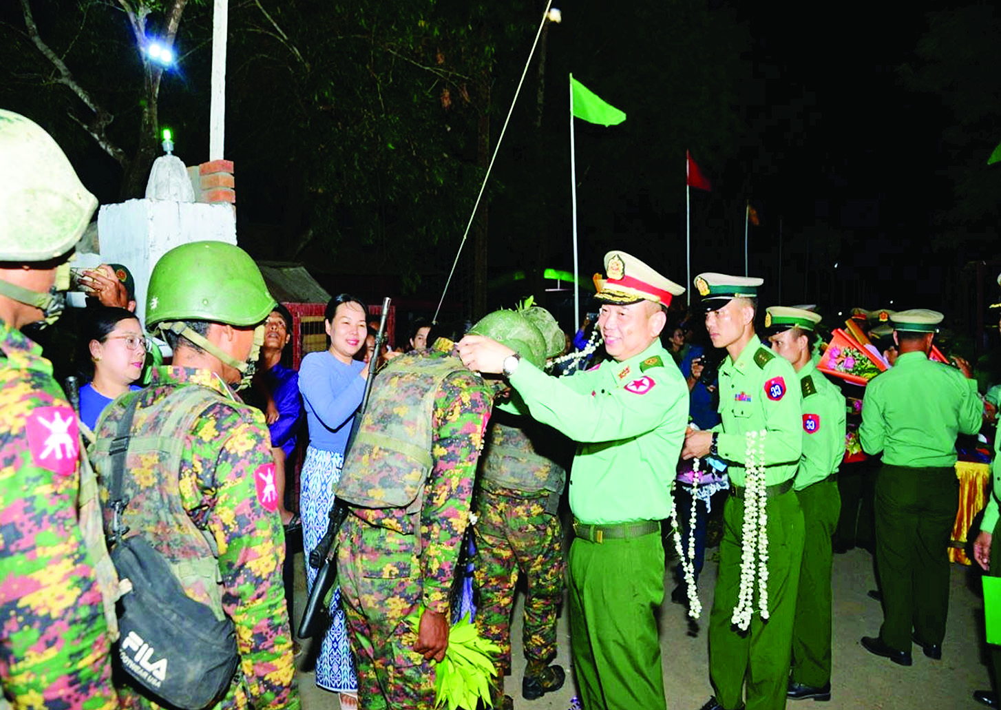 နိုင်ငံတော်တည်ငြိမ်ရေးနှင့် နယ်မြေအေးချမ်းသာယာရေးအတွက် ရခိုင်ပြည်နယ် ကျောက်ဖြူမြို့နယ် ဒေသတစ်ဝိုက် နယ်မြေလုံခြုံရေးတာဝန်များကို ထမ်းဆောင်၍ ပြန်လည်ရောက်ရှိလာသော ရှေ့တန်းပြန် နိုင်ငံ့သားကောင်း တပ်မတော်သားများအား ဂုဏ်ပြုကြိုဆိုခြင်းကို ယနေ့ညနေပိုင်းတွင် ရန်ကုန် တိုင်းဒေသကြီး လှည်းကူးမြို့နယ် ရဲမွန်တပ်မြို့ရှိ နယ်မြေခံတပ်ရင်း၌ပြုလုပ်ရာ ရန်ကုန်တိုင်းစစ်ဌာနချုပ်တိုင်းမှူး ဗိုလ်မှူးချုပ် တင်မင်းလတ်နှင့် တာဝန်ရှိသူများ၊ မြန်မာနိုင်ငံရဲတပ်ဖွဲ့ဝင်များ၊ မြန်မာနိုင်ငံစစ်မှုထမ်းဟောင်းအဖွဲ့ဝင်များ၊ ဌာနဆိုင်ရာ တာဝန်ရှိသူများနှင့် ဒေသခံပြည်သူများ ပါဝင်တက်ရောက်ဂုဏ်ပြုကြိုဆိုကြသည်။
