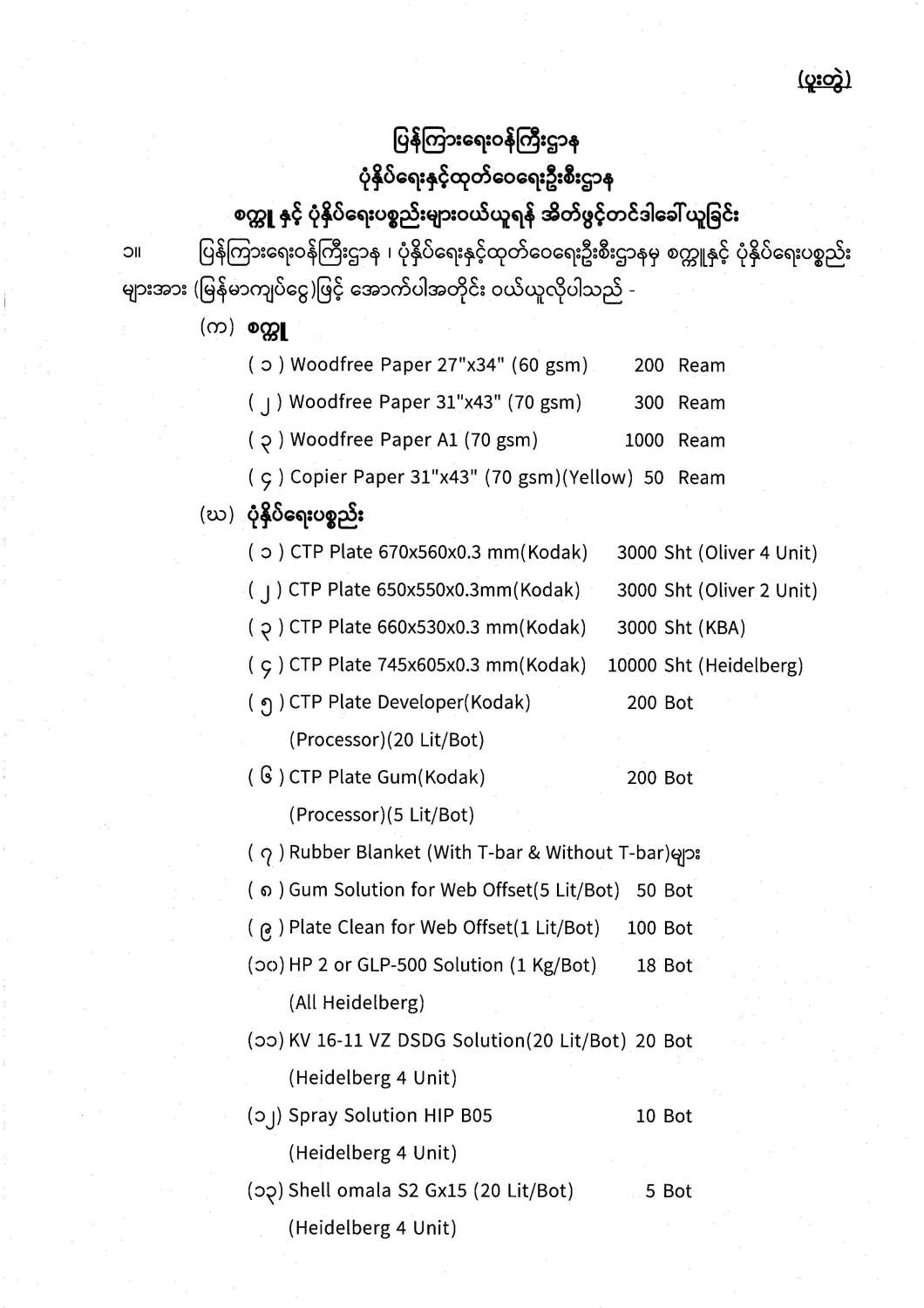 စက္ကူ နှင့် ပုံနှိပ်ရေးပစ္စည်းများဝယ်ယူရန် အိတ်ဖွင့်တင်ဒါခေါ်ယူခြင်း