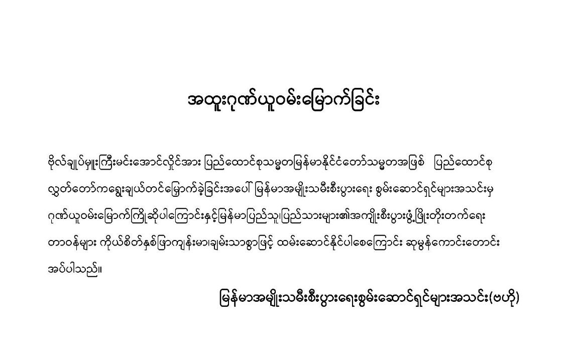အဆိုပါထုတ်ပြန်ကြေညာချက်များတွင် ပြည်ထောင်စုသမ္မတ မြန်မာနိုင်ငံတော် နိုင်ငံတော်သမ္မတအဖြစ် ဗိုလ်ချုပ်မှူးကြီး မင်းအောင်လှိုင်အား ပြည်ထောင်စုလွှတ်တော်က ရွေးချယ်တင်မြှောက်ခဲ့သည့်အတွက် အထူးလှိုက်လှဲစွာ ဂုဏ်ယူဝမ်းမြောက်ပါကြောင်း၊ မြန်မာပြည်သူ၊ ပြည်သားများ၏ အကျိုးစီးပွားဖွံ့ဖြိုးတိုးတက်ရေးတာဝန်များ ကိုယ်စိတ်နှစ်ဖြာကျန်းမာ၊ ချမ်းသာစွာဖြင့် ထမ်းဆောင်နိုင်ပါစေကြောင်း၊ နိုင်ငံတော်သမ္မတကြီး၏ ဦးဆောင်မှုအောက်တွင် ပြည်ထောင်စုသမ္မတမြန်မာနိုင်ငံတော်ကြီး ငြိမ်းချမ်းသာယာဝပြော၍ ပိုမိုစည်ပင်ဖွံ့ဖြိုးတိုးတက်ပါစေကြောင်း စသည်ဖြင့် ပါရှိကြောင်း သိရှိရသည်။