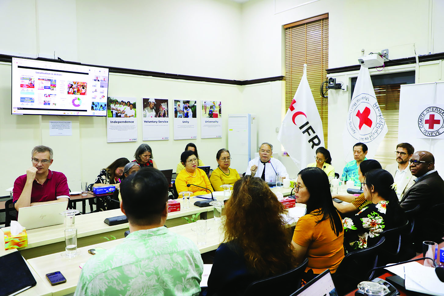 ဆွေးနွေးပွဲတွင် မြန်မာနိုင်ငံကြက်ခြေနီအသင်းဥက္ကဋ္ဌ ပါမောက္ခ ဒေါက်တာ မျိုးညွန့်က အသင်းရန်ကုန်ရုံးခွဲမှလည်းကောင်း၊ အပြည်ပြည်ဆိုင်ရာကြက်ခြေနီနှင့် လခြမ်းနီအသင်းများ ဖက်ဒရေးရှင်း (IFRC) မှ Asia Pacific Regional Director - Mr. Alexander MATHEOU ၊ အပြည်ပြည်ဆိုင်ရာ ကြက်ခြေနီကော်မတီ (ICRC) Regional Director ဖြစ်သူ Mr.Regis Savioz တို့က online မှ လည်းကောင်း တက်ရောက်၍ ဦးဆောင်ဆွေးနွေးကြသည်။