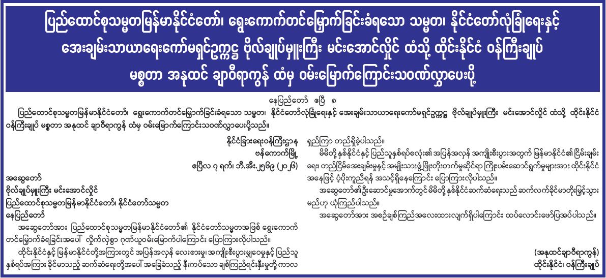 ပြည်ထောင်စုသမ္မတမြန်မာနိုင်ငံတော်၊ ရွေးကောက်တင်မြှောက်ခြင်းခံရသော သမ္မတ၊ နိုင်ငံတော်လုံခြုံရေးနှင့် အေးချမ်းသာယာရေးကော်မရှင်ဥက္ကဋ္ဌ ဗိုလ်ချုပ်မှူးကြီး မင်းအောင်လှိုင်ထံသို့ ထိုင်းနိုင်ငံ ဝန်ကြီးချုပ် မစ္စတာ အနုထင် ချာဝီရာကွန် ထံမှ ဝမ်းမြောက်ကြောင်းသဝဏ်လွှာပေးပို့