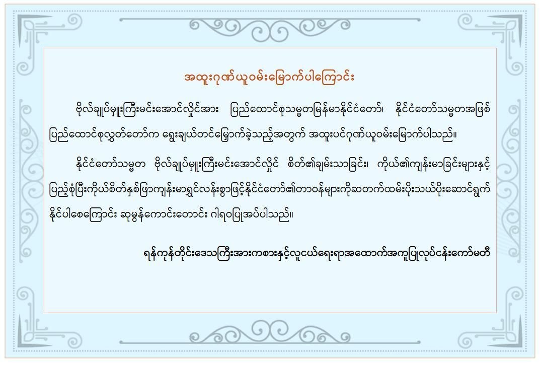 အဆိုပါ ထုတ်ပြန်ကြေညာချက်များတွင် ပြည်ထောင်စုသမ္မတမြန်မာနိုင်ငံတော် နိုင်ငံတော်သမ္မတအဖြစ် ဗိုလ်ချုပ်မှူးကြီးမင်းအောင်လှိုင်အား ပြည်ထောင်စုလွှတ်တော်က ရွေးချယ်တင်မြှောက်ခဲ့သည့်အတွက် အထူးလှိုက်လှဲစွာဂုဏ်ယူဝမ်းမြောက်ပါကြောင်း၊ နိုင်ငံတော်သမ္မတ ဗိုလ်ချုပ်မှူးကြီးမင်းအောင်လှိုင် စိတ်၏ချမ်းသာခြင်း၊ ကိုယ်၏ကျန်းမာခြင်းများနှင့်ပြည့်စုံပြီး ကိုယ်စိတ်နှစ်ဖြာကျန်းမာရွှင်လန်းစွာဖြင့် နိုင်ငံတော်၏ အကျိုး၊ အမျိုးဘာသာ သာသနာအကျိုးတို့ကို ဆတက်ထမ်းပိုး သယ်ပိုးဆောင်ရွက်နိုင်ပါစေကြောင်း၊ သမ္မကြီးဦးဆောင်မှုအောက်တွင် မြန်မာနိုင်ငံ၏ စီးပွားရေးကဏ္ဍများ၊ အထူးသဖြင့် အသေးစား၊ အငယ်စား၊ အလတ်စား စီးပွားရေးလုပ်ငန်းကဏ္ဍသည် ပိုမိုတိုးတက်ဖွံ့ဖြိုးလာမည်ဟု မျှော်လင့်ပါကြောင်း၊ ကျန်းမာခြင်းသုခနှင့် ပြည့်စုံပါစေ၊ ဘေးရန်အပေါင်းမှ ကင်းဝေးပါစေ၊ ကပ်ကြီးသုံးပါးမှ ကင်းဝေးပါစေကြောင်းစသည်ဖြင့် ပါရှိကြောင်း သိရှိရသည်။