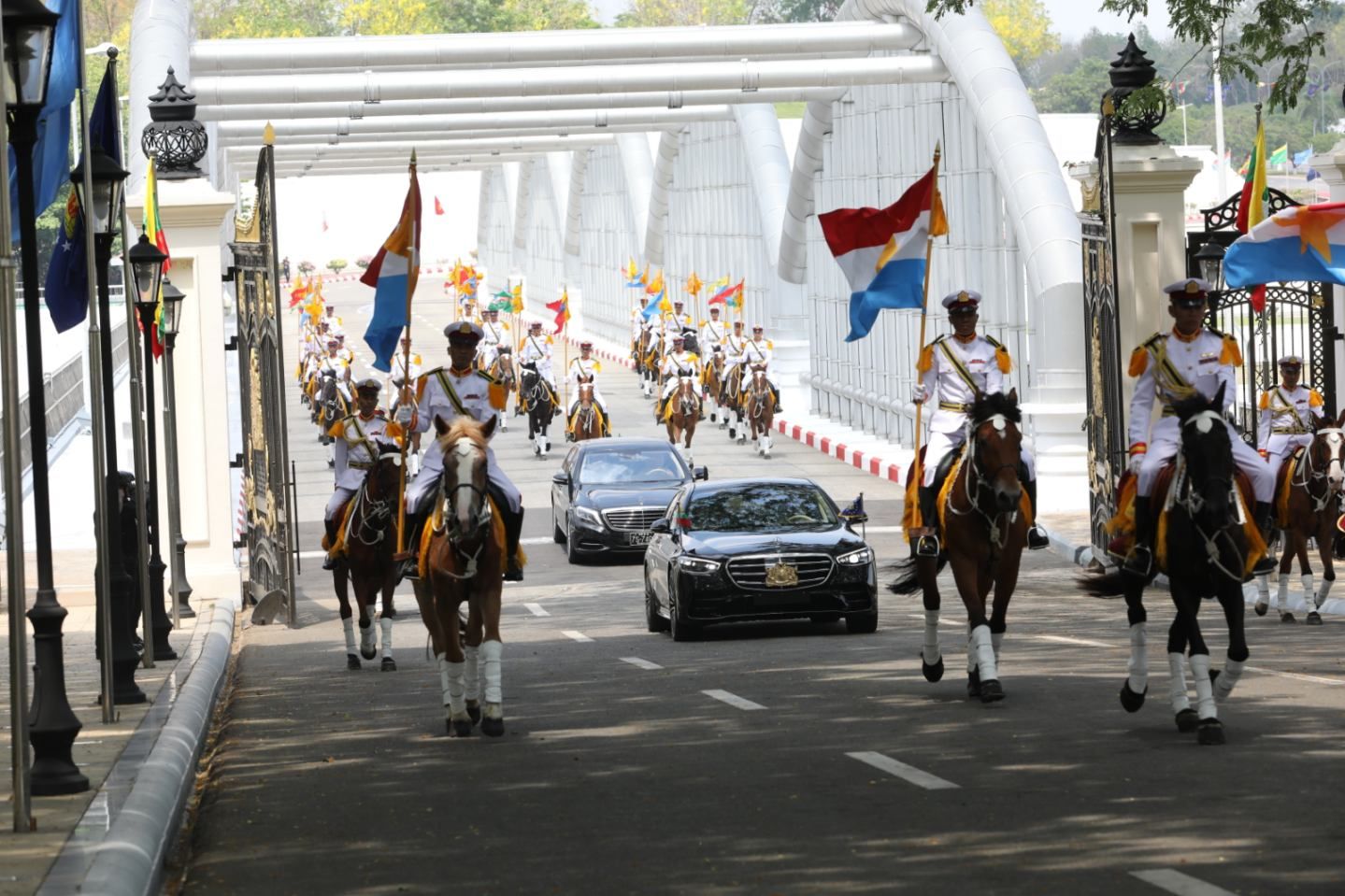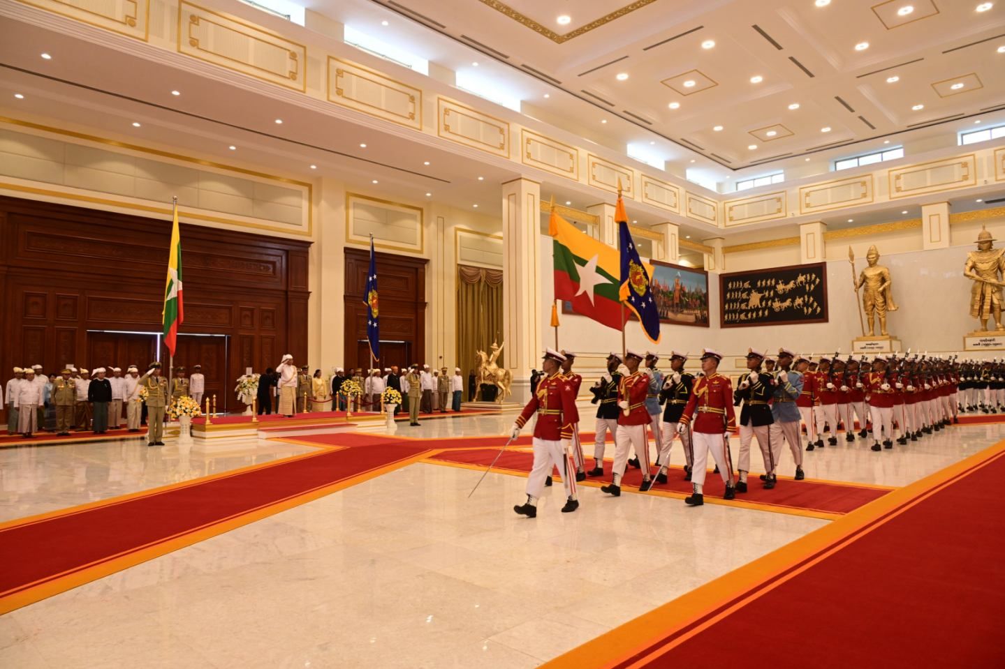 ဦးစွာ နိုင်ငံတော်သမ္မတ ဦးမင်းအောင်လှိုင် လိုက်ပါလာသည့် အထူးယာဉ်တန်းသည် ဂုဏ်ပြုမြင်းစီးတပ်ဖွဲ့၏ ဦးဆောင်ကြိုဆိုမှုဖြင့် နိုင်ငံတော်သမ္မတ၏ ဧည့်ဆောင်တော်ရှိ ဂုဏ်ပြုဆောင်ခန်းမကြီးသို့ ရောက်ရှိလာရာ ဒုတိယသမ္မတ ဦးညိုစော၊ နိုင်ငံတော်သမ္မတရုံး ပြည်ထောင်စုဝန်ကြီး ဦးခင်မောင်ရီတို့က ကြိုဆိုနှုတ်ဆက်ကြသည်။