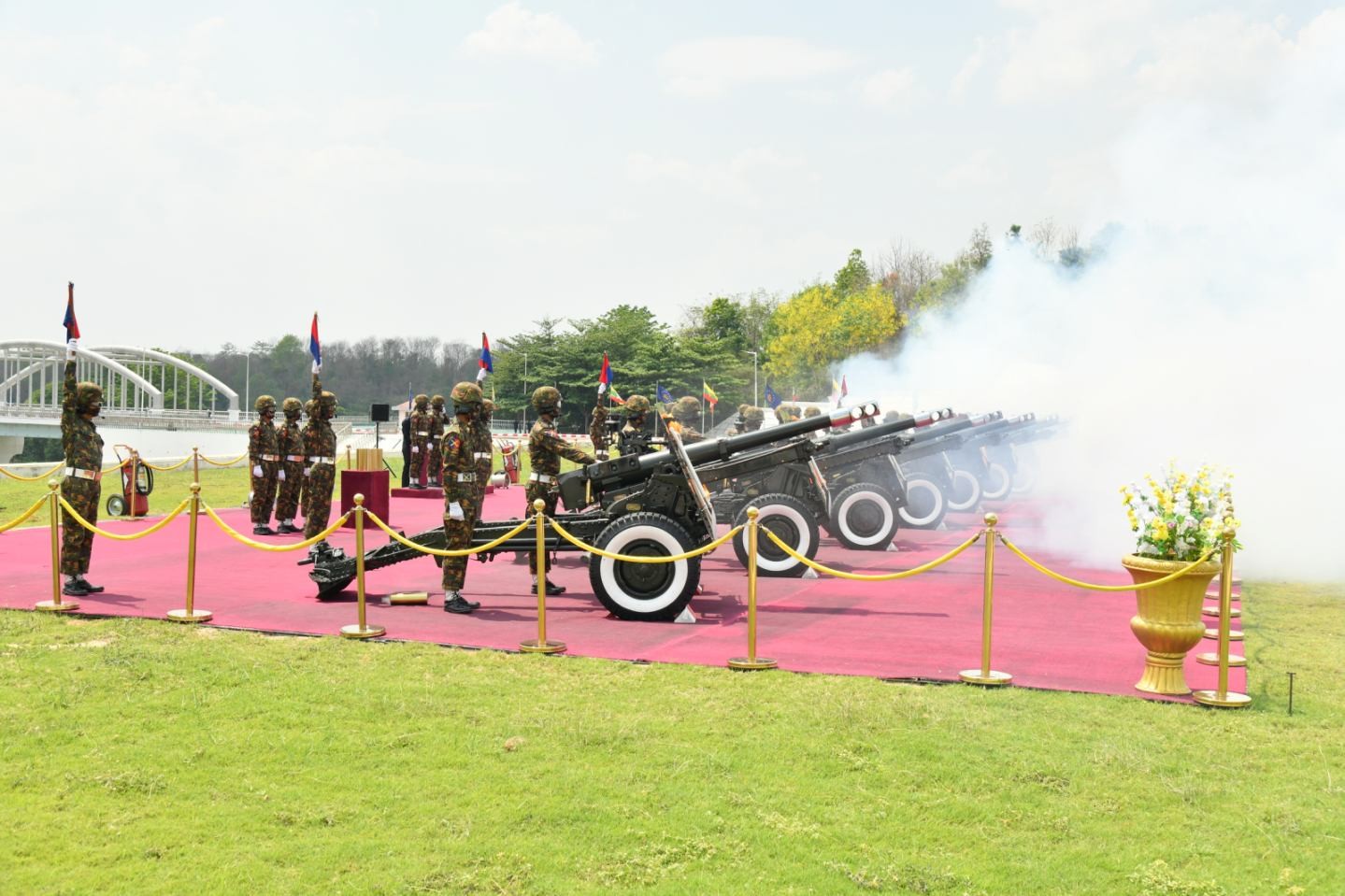 ထို့နောက် နိုင်ငံတော်သမ္မတ ဦးမင်းအောင်လှိုင်သည် ဂုဏ်ပြုခံစင်မြင့်၌ နေရာယူပြီး ဂုဏ်ပြုတပ်ဖွဲ့၏ အလေးပြုခြင်းကိုခံယူသည်။ ထိုသို့ ဂုဏ်ပြုတပ်ဖွဲ့၏ အလေးပြုခြင်းကို ခံယူနေချိန်တွင် ဂုဏ်ပြုအမြောက်တပ်ဖွဲ့မှလည်း အမြောက် ၂၁ ချက်ကို စစ်ရေးပြအခမ်းအနားဖြင့် ဂုဏ်ပြုပစ်ဖောက်သည်။
