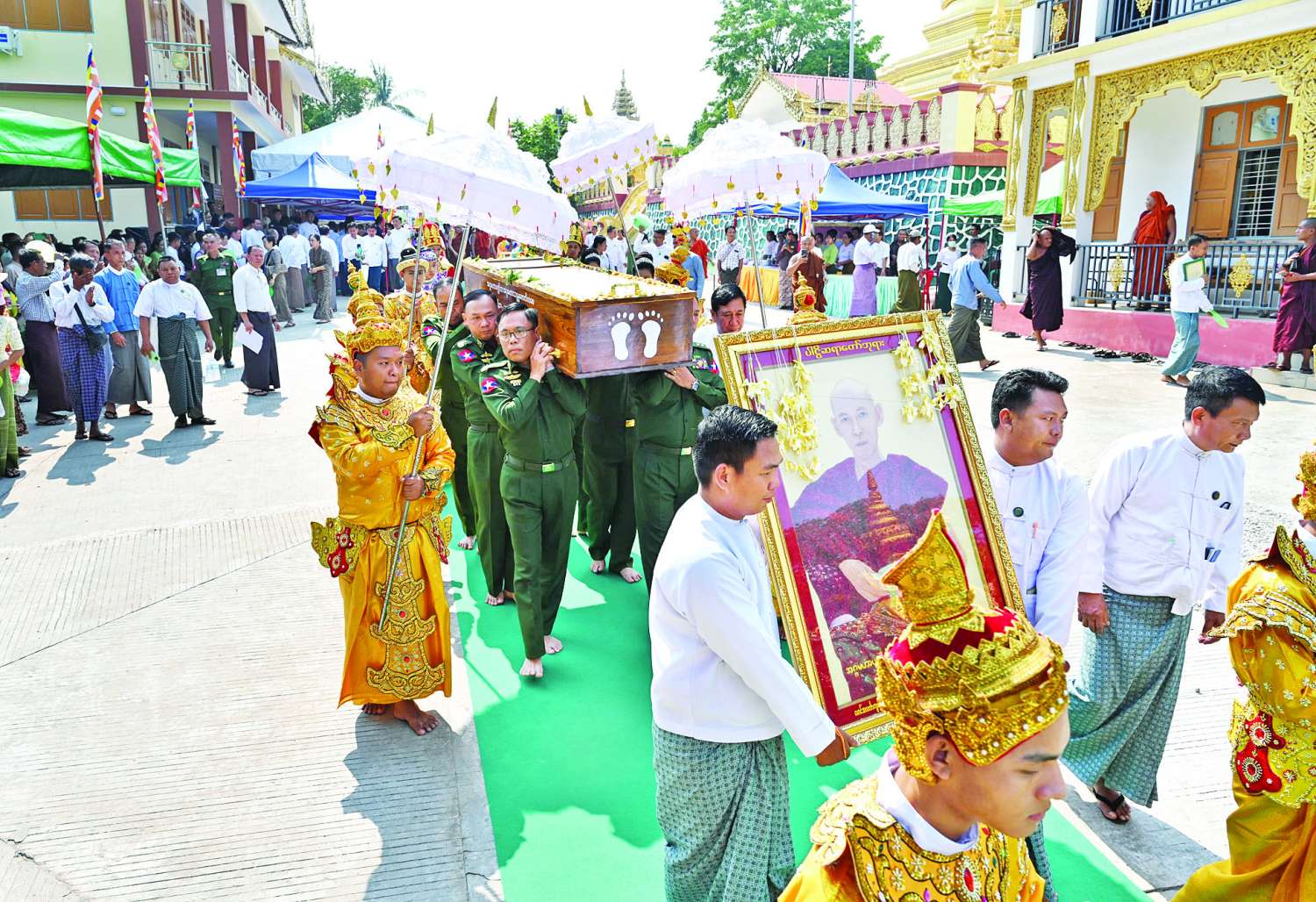 ထို့နောက် အခမ်းအနားမှူးက ပါဠိဆရာတော်ကြီး၏ ရုပ်ကလာပ်တော်အား ကရဝိက်ယာဉ်ပေါ်သို့ ကြွချီတော်မူပါရန် အဘိယာစနနိမန္တနဂါထာဖြင့် တောင်းပန်လျှောက်ထားပြီး ကရဝိက်ယာဉ်ပေါ်သို့ ပင့်ဆောင်ရန်အတွက် ဆရာတော်ကြီး၏ပုံတော်နှင့် ရုပ်ကလာပ်တော်အား တပ်မတော်မှအဆင့်မြင့်အရာရှိကြီးများနှင့် ပြည်ထောင်စုဝန်ကြီးများက သတ်မှတ်နေရာအသီးသီးမှ ကရဝိက်ယာဉ်တော်ပေါ်အထိ ပင့်ဆောင်ကြပြီး လောင်တိုက်တော်တည်ရှိရာ ဥပ္ပါတသန္တိစေတီတော် တပေါင်းပွဲတော်ကွင်းသို့ ပင့်ဆောင်ကြသည်။