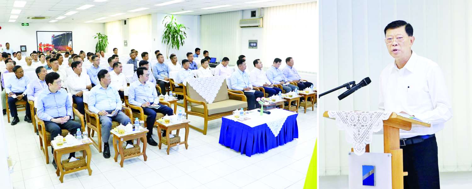 ယင်းနောက် ပြည်ထောင်စုဝန်ကြီးက မြန်မာနိုင်ငံ၏ နှစ်စဉ်ပင်လယ်ရေကြောင်းဖြင့် ကုန်သွယ်မှုတန်ဖိုးသည် နိုင်ငံတကာကုန်သွယ်မှုတန်ဖိုး၏ ပျမ်းမျှ ၇၀ ရာနှုန်းရှိသဖြင့် ပင်လယ်ရေကြောင်းဖြင့် ကုန်သွယ်မှု၏ အဓိက ဝင်/ထွက်ပေါက်ဖြစ်သော ရန်ကုန်နှင့် သီလဝါဧရိယာရှိ ဆိပ်ကမ်းတံတားများအပါအဝင် ဆိပ်ကမ်းလုပ်ငန်း ကဏ္ဍတစ်ခုလုံး စဉ်ဆက်မပြတ်ဖွံ့ဖြိုးတိုးတက်ရေးအတွက် အစိုးရ-ပုဂ္ဂလိက ပူးပေါင်းဆောင်ရွက်မှုကို အလေးထားဆောင်ရွက်ကြရန်လိုကြောင်း၊ ရန်ကုန်ဆိပ်ကမ်း၏ ကုန်ကိုင်တွယ်ရရှိမှုပမာဏကို မြှင့်တင်နိုင်ရန် ပြည်တွင်းလိုအပ်ချက်ကို ဖြည့်ဆည်းပေးခြင်းအပြင် နိုင်ငံ၏ မဟာဗျူဟာမြောက် ပထဝီဝင်အနေအထားကို အကျိုးရှိစွာအသုံးချပြီး အိမ်နီးချင်းနိုင်ငံများ၏ ပို့ကုန်/သွင်းကုန်များကိုပါ သယ်ယူ ပို့ဆောင်ပေးနိုင်မည့် ကုန်း-ရေ နှစ်သွယ်ဘက်စုံသယ်ယူပို့ဆောင်ရေးစနစ်ကို အကောင်အထည်ဖော်ရန်လိုကြောင်း၊ ထို့ကြောင့်ရန်ကုန် ဆိပ်ကမ်းမှတစ်ဆင့် ရေယာဉ် လွှဲပြောင်းတင်ဆောင်ခြင်း(Transshipment) ဝန်ဆောင်မှုနှင့် နိုင်ငံဖြတ်သန်း ကုန်သွယ်မှု (Transit Trade) ဝန်ဆောင်မှုများ ကိုပေးနိုင်ရန် အဆင်သင့်ဖြစ်မှုအတွက် ဆိပ်ကမ်းတံတားများကို ဆက်လက်တိုးချဲ့ တည်ဆောက်လုပ်ကိုင်ကြရန်လိုအပ်ပြီး နိုင်ငံ၏စွမ်းအင်လုံခြုံမှုအတွက်လည်း စက်သုံးဆီတံတားများနှင့် သိုလှောင်ကန်များကို မြေနေရာချထားပေးပြီးဖြစ်သည့် ပုဂ္ဂလိကလုပ်ငန်းရှင်များက ဆက်လက်ရင်းနှီးမြှုပ်နှံ တည်ဆောက်လုပ်ကိုင်ကြရန်၊ ဆိပ်ကမ်းလုပ်ငန်းစွမ်းဆောင်မှုကို မြှင့်တင်နိုင်ရေးအတွက် ဒစ်ဂျစ်တယ်စနစ်ဖြင့် အသွင်ကူးပြောင်းဆောင်ရွက်ကြရန်၊ စွမ်းအင်သုံးစွဲမှု လျှော့ချနိုင်ရေးအတွက် ဆိုလာစနစ်ကို အစားထိုးသုံးစွဲကြရန်နှင့် ဘက်ထရီစနစ်သုံး ကုန်ကိုင်တွယ်စက်ကိရိယာများနှင့် ယာဉ်များကို ပြောင်းလဲ အသုံးပြုကြရန် တိုက်တွန်းပြောကြားသည်။