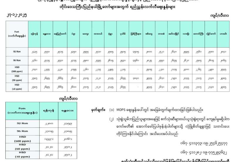 ရန်ကုန်မြို့နှင့် မန္တလေးမြို့အတွက် ရည်ညွှန်းလက်ကားဈေးနှုန်းများနှင့် ပြည်ထောင်စုနယ်မြေ နေပြည်တော်၊ တိုင်းဒေသကြီး/ ပြည်နယ် မြို့တော်များအတွက် ရည်ညွှန်းလက်လီဈေးနှုန်းများ
