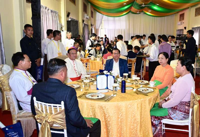 မြန်မာနိုင်ငံခရစ်ယာန်အသင်းတော်ပေါင်းစုံအဖွဲ့ချုပ်ကြီးများက ကြီးမှူးကျင်းပသည့် ခရစ်တော်မွေးနေ့ (ခရစ္စမတ်) ကျေးဇူးတော် ချီးမွမ်းခြင်းနှင့် မိတ်သဟာယမိတ်ဆုံစားပွဲအခမ်းအနားကို ယနေ့နံနက်ပိုင်းတွင် ရန်ကုန်တိုင်းဒေသကြီး၊ ဗိုလ်တထောင်မြို့နယ်ရှိ စိန့်မေရီကာသီဒြယ်ကက်သလစ်ဘုရားကျောင်းတော်ကြီး၌ ကျင်းပပြုလုပ်ရာ ပြည်ထောင်စုသမ္မတမြန်မာနိုင်ငံတော်ယာယီသမ္မတ နိုင်ငံတော်လုံခြုံရေးနှင့်အေးချမ်းသာယာရေးကော်မရှင်ဥက္ကဋ္ဌ ဗိုလ်ချုပ်မှူးကြီး မင်းအောင်လှိုင် တက်ရောက်ချီးမြှင့်သည်။