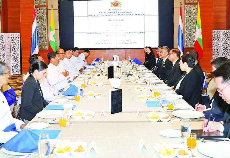 နိုင်ငံခြားရေးဝန်ကြီးဌာန ပြည်ထောင်စုဝန်ကြီး ဦးသန်းဆွေသည် ယနေ့တွင် နေပြည်တော်သို့ နေ့ချင်းပြန်ခရီးလာရောက်ခဲ့သည့် ထိုင်းနိုင်ငံခြားရေးဝန်ကြီး H.E. Mr. Sihasak Phuangketkeow နှင့် တွေ့ဆုံဆွေးနွေးပြီး ၎င်းနှင့်ကိုယ်စားလှယ်အဖွဲ့အား Jasmine Nay Pyi Taw Hotel ၌ အလုပ်သဘော နေ့လယ်စာဖြင့် တည်ခင်းဧည့်ခံသည်။
