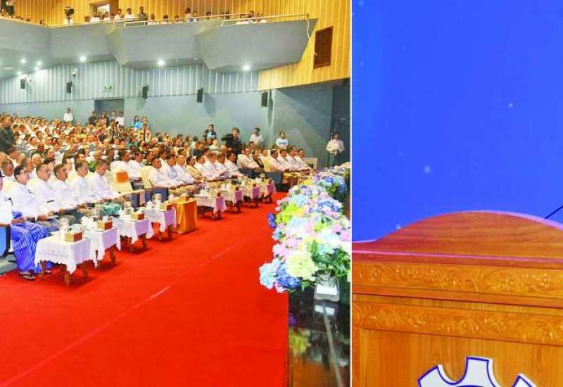 ပြည်ထောင်စုသမ္မတမြန်မာနိုင်ငံ ကုန်သည်များနှင့် စက်မှုလက်မှုလုပ်ငန်းရှင်များ အသင်းချုပ် (၃၄) ကြိမ်မြောက် နှစ်ပတ်လည်အသင်းသားစုံညီအစည်းအဝေးကို ယနေ့မွန်းလွဲပိုင်းတွင် ရန်ကုန်မြို့ရှိ အမျိုးသားကဇတ်ရုံ၌ ကျင်းပပြုလုပ်ရာ ပြည်ထောင်စုသမ္မတမြန်မာနိုင်ငံတော် ယာယီသမ္မတနိုင်ငံတော်လုံခြုံရေးနှင့် အေးချမ်းသာယာရေးကော်မရှင်ဥက္ကဋ္ဌ ဗိုလ်ချုပ်မှူးကြီး မင်းအောင်လှိုင် တက်ရောက်အမှာစကားပြောကြားသည်။