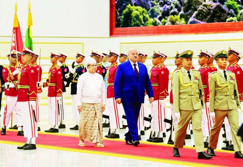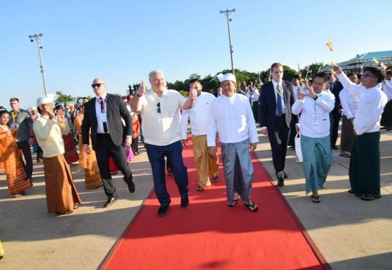 ပြည်ထောင်စုသမ္မတမြန်မာနိုင်ငံတော်ယာယီသမ္မတ နိုင်ငံတော်လုံခြုံရေးနှင့်အေးချမ်းသာယာရေးကော်မရှင်ဥက္ကဋ္ဌ ဗိုလ်ချုပ်မှူးကြီး မင်းအောင်လှိုင်သည် မြန်မာနိုင်ငံသို့ တရားဝင်ချစ်ကြည်ရေးခရီး ရောက်ရှိလာသော ဘယ်လာရုစ်သမ္မတနိုင်ငံသမ္မတ H.E. Mr. Aleksandr Lukashenko အား ယနေ့နံနက်ပိုင်းတွင် သမ္မတအိမ်တော် ဆင်ဖြူတော်ဆောင်ဧည့်ခန်းမ၌ ဂုဏ်ပြုတပ်ဖွဲ့ဖြင့် ကြိုဆိုသည်။