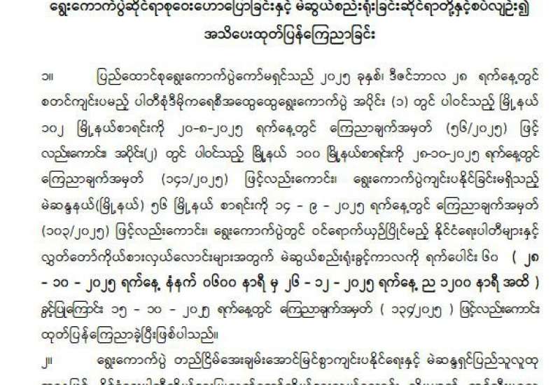 ရွေးကောက်ပွဲဆိုင်ရာစုဝေးဟောပြောခြင်းနှင့် မဲဆွယ်စည်းရုံးခြင်းဆိုင်ရာတို့နှင့်စပ်လျဉ်း၍ အသိပေးထုတ်ပြန်ကြေညာခြင်း