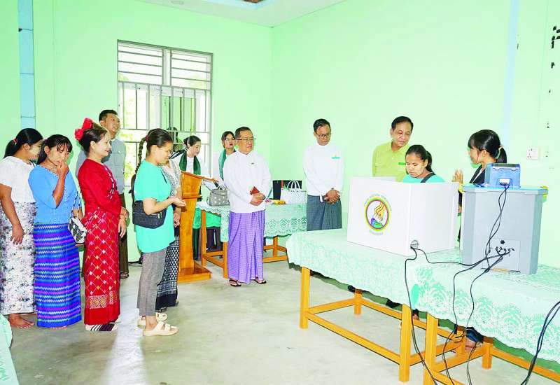 မိတ္ထီလာမြို့နယ် ဓမ္မပါလကျေးရွာ ဘဝသစ်မျက်မမြင် ပညာသင်ကျောင်း၌ ယမန်နေ့နံနက်ပိုင်းက ကျင်းပပြုလုပ်သည့် မသန်စွမ်းသူများ ကိုယ်တိုင်ဆန္ဒမဲပေးနိုင်ရေး အသိပညာပေးခြင်းနှင့် မျက်မမြင်စာဖြင့် အထူးပြုလုပ်ထားသည့် မဲပေးစက်များဖြင့် လက်တွေ့စမ်းသပ်မဲပေးခြင်းအခမ်းအနားသို့ ပြည်ထောင်စုရွေးကောက်ပွဲကော်မရှင်အဖွဲ့ဝင် (မန္တလေးတိုင်းဒေသ ကြီးတာဝန်ခံ) ဦးသန်းအောင်ကျော် တက်ရောက်ကြည့်ရှုအားပေးသည်။
