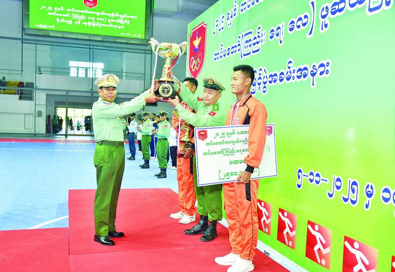၂၀၂၅ ခုနှစ်၊ တပ်မတော်ကာကွယ်ရေးဦးစီးချုပ်ဖလား တပ်မတော်(ကြည်း၊ ရေ၊ လေ) ဖူဆယ်ပြိုင်ပွဲ ဗိုလ်လုပွဲနှင့် ဆုချီးမြှင့်ပွဲအခမ်းအနားကို ယနေ့နံနက်ပိုင်းတွင် နေပြည်တော်ရှိ ဇေယျာသီရိတပ်မတော်အားကစားရုံ (A)ရုံ၌ ကျင်းပပြုလုပ်ရာ နိုင်ငံတော်လုံခြုံရေးနှင့် အေးချမ်းသာယာရေးကော်မရှင်ဥက္ကဋ္ဌ တပ်မတော်ကာကွယ်ရေးဦးစီးချုပ် ဗိုလ်ချုပ်မှူးကြီးမင်းအောင်လှိုင်ကိုယ်စား တပ်မတော်အားကစားနှင့် ကာယပညာအုပ်ချုပ်ရေးအဖွဲ့ဥက္ကဋ္ဌ စစ်ရေးချုပ် ဒုတိယဗိုလ်ချုပ်ကြီးဖုန်းမြတ် တက်ရောက်သည်။