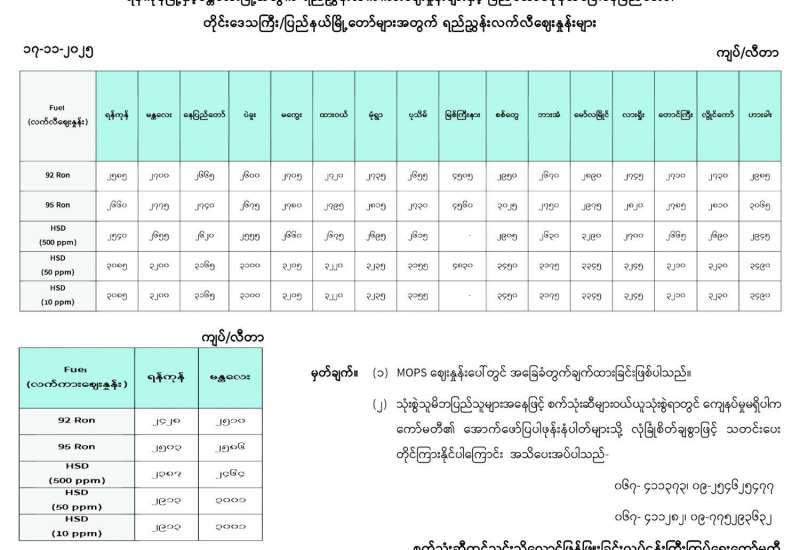 ရန်ကုန်မြို့နှင့် မန္တလေးမြို့အတွက် ရည်ညွှန်းလက်ကားဈေးနှုန်းများနှင့် ပြည်ထောင်စုနယ်မြေ နေပြည်တော်၊ တိုင်းဒေသကြီး/ပြည်နယ် မြို့တော်များအတွက် ရည်ညွှန်းလက်လီဈေးနှုန်းများ