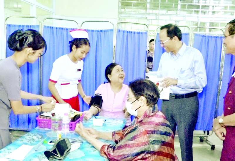 ကျန်းမာရေးဝန်ကြီးဌာန ပြည်ထောင်စုဝန်ကြီး ပါမောက္ခ ဒေါက်တာ သက်ခိုင်ဝင်းသည် ကျန်းမာရေးလူ့စွမ်းအားအရင်းအမြစ်ဦးစီးဌာန ညွှန်ကြားရေးမှူးချုပ် ဒေါက်တာတင်ထွန်းနှင့်အတူ ယနေ့နံနက်ပိုင်းတွင် ရန်ကုန်ပြည်သူ့ဆေးရုံကြီးသို့ သွားရောက်၍ နှစ်စဉ်ပြုလုပ်သော သက်ကြီးဆရာဝန်ကြီးများ ကျန်းမာရေးစစ်ဆေးကုသမှု ဆောင်ရွက်ခြင်းကို ကြည့်ရှုအားပေးသည်။