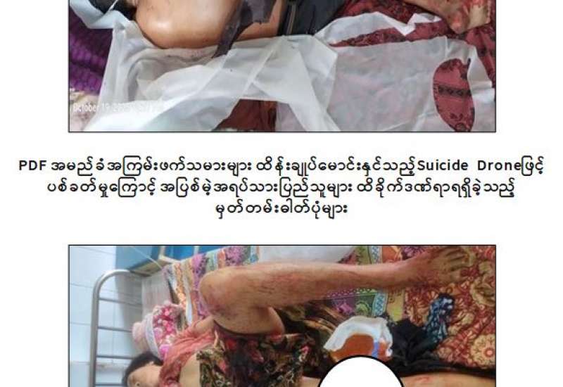 PDF အမည်ခံ အကြမ်းဖက်သမားများသည် ၎င်းတို့၏ကိုယ်ကျိုးစီးပွားနှင့် အစွန်းရောက်နိုင်ငံရေးခံယူချက်များအတွက် နိုင်ငံတော်တာဝန်ကိုထမ်းဆောင်နေကြသည့် နိုင်ငံ့ဝန်ထမ်းများနှင့် အေးချမ်းစွာနေထိုင်နေကြသည့် ပြည်သူလူထုအား လက်နက်အားကိုးဖြင့် ဖမ်းဆီး၊ နှိပ်စက်၊ သတ်ဖြတ်ခြင်း၊ လမ်းတံတားများအား မိုင်းထောင်ဖောက်ခွဲဖျက်ဆီးခြင်းတို့ကို ဆင်ခြင်တုံတရားမဲ့စွာ လုပ်ဆောင်လျက်ရှိကြရာ ယနေ့နံနက်ပိုင်းတွင်လည်း ၎င်းတို့ထိန်းချုပ်မောင်းနှင်ပြီး အကြောင်းမဲ့ပစ်ခတ်ခဲ့သည့် Suicide Drone ကျရောက်ပေါက်ကွဲမှုကြောင့် စစ်ကိုင်းတိုင်းဒေသကြီး၊ ကလေးမြို့၊ ပင်လုံရပ်ကွက်ရှိ ဒေသခံပြည်သူ အမျိုးသား ၁ ဦးနှင့် အမျိုးသမီး ဗုံးစထိမှန်ဒဏ်ရာများရရှိခဲ့ကြောင်း သိရှိရသည်။