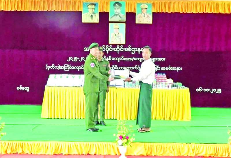 ၂၀၂၅−၂၀၂၆ ပညာသင်နှစ်တွင် တက်ရောက်ပညာသင်ကြားလျက်ရှိသည့် အနောက်ပိုင်းတိုင်းစစ်ဌာနချုပ်မှ တပ်မတော်မိသားစုဝင် ကျောင်းသားကျောင်းသူများအား(ဒုတိယအကြိမ်)ကျောင်းဝတ်စုံနှင့်စာရေးကိရိယာများပေးအပ်ခြင်းကို ယနေ့တွင် စစ်တွေတပ်နယ်ခန်းမ၌ပြုလုပ်ရာ တိုင်းမှူး ဗိုလ်ချုပ်ကျော်စွာဦးနှင့် တာဝန်ရှိသူများ၊ အရာရှိ၊ စစ်သည်၊ မိသားစုများ၊ ကျောင်းသား ကျောင်းသူများ တက်ရောက်ကြသည်။