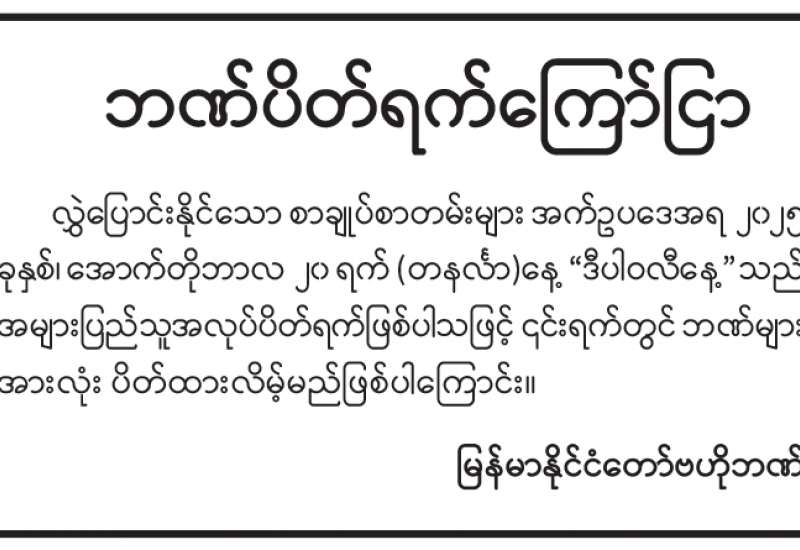 ပို့ဆောင်ရေးနှင့်ဆက်သွယ်ရေးဝန်ကြီးဌာန မြန်မာ့စာတိုက်လုပ်ငန်းမှ တိုင်းရင်းသားလူမျိုးများအလိုက်ထုတ်ဝေခဲ့ပြီးသောတံဆိပ်ခေါင်းများကို တံဆိပ်ခေါင်းစုဆောင်းသူဝါသနာရှင်များ တစ်စုတစ်စည်းတည်းစုဆောင်းနိုင်ကြရန်ရည်ရွယ်၍ တိုင်းရင်းသားလူမျိုးများစာပို့တံဆိပ်ခေါင်း ၂၀၀ ကျပ်တန် (၈)လုံးပါ Block of Stamp အထူးထုတ်စာပို့တံဆိပ်ခေါင်းသစ်တစ်မျိုးအား ၂၀၂၅ ခုနှစ် အောက်တိုဘာ ၂၀ ရက် မြန်မာသက္ကရာဇ် ၁၃၈၇ ခုနှစ် သီတင်းကျွတ်လပြည့်ကျော် ၁၄ ရက် (တနင်္လာနေ့) နံနက် ၉ နာရီခွဲမှစတင်၍ နေပြည်တော်ဗဟိုစာတိုက်ကြီး၊ ရန်ကုန်စာတိုက်ကြီး၊ မန္တလေးစာတိုက်ကြီးတို့နှင့် တိုင်းဒေသကြီး/ပြည်နယ်များရှိစာတိုက်ကြီးများတွင် တစ်ပြိုင်တည်းရောင်းချပေးသွားမည်ဖြစ်သည်။