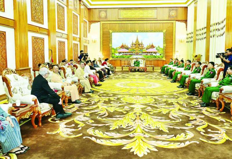 နိုင်ငံတော်လုံခြုံရေးနှင့် အေးချမ်းသာယာရေးကော်မရှင်ဥက္ကဋ္ဌ တပ်မတော်ကာကွယ်ရေးဦးစီးချုပ် ဗိုလ်ချုပ်မှူးကြီး မင်းအောင်လှိုင်ထံသို့ ငြိမ်းချမ်းရေးဆွေးနွေးပွဲသို့ တက်ရောက်ခဲ့သည့် တိုင်းရင်းသားလက်နက်ကိုင်ကိုယ်စားလှယ်အဖွဲ့များက ယနေ့နံနက်ပိုင်းတွင် နေပြည်တော်ရှိ ဘုရင့်နောင်ရိပ်သာဧည့်ခန်းမ၌ လာရောက်ဂါရဝပြုတွေ့ဆုံသည်။