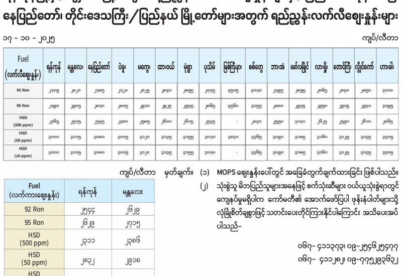 ရန်ကုန်မြို့နှင့် မန္တလေးမြို့အတွက် ရည်ညွှန်းလက်ကားဈေးနှုန်းများနှင့် ပြည်ထောင်စုနယ်မြေ နေပြည်တော်၊ တိုင်းဒေသကြီး/ပြည်နယ် မြို့တော်များအတွက် ရည်ညွှန်းလက်လီစျေးနှုန်းများ