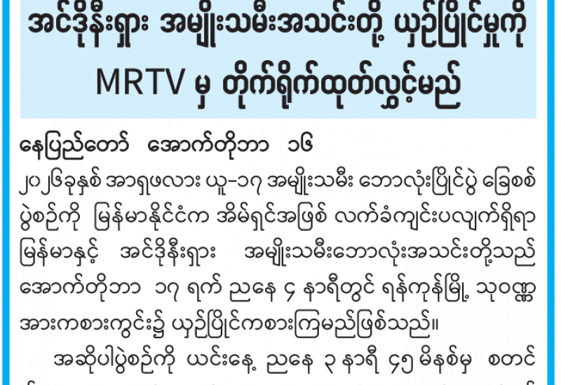 ၂၀၂၆ ခုနှစ် အာရှဖလား ယူ - ၁၇ အမျိုးသမီးဘောလုံးပြိုင်ပွဲ ခြေစစ်ပွဲစဉ် မြန်မာနှင့် အင်ဒိုနီးရှား အမျိုးသမီးအသင်းတို့ ယှဉ်ပြိုင်မှုကို MRTV မှ တိုက်ရိုက်ထုတ်လွှင့်မည်