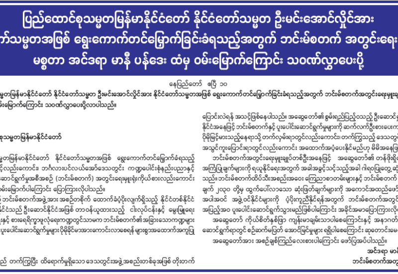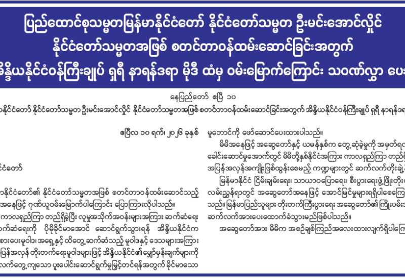 ပြည်ထောင်စုသမ္မတမြန်မာနိုင်ငံတော် နိုင်ငံတော်သမ္မတ ဦးမင်းအောင်လှိုင်အား နိုင်ငံတော်သမ္မတအဖြစ် ရွေးကောက်တင်မြှောက်ခြင်းခံရသည့်အတွက် ဘင်းမ်စတက် အတွင်းရေးမှူးချုပ် မစ္စတာ အင်ဒရာ မာနီ ပန်ဒေး ထံမှ ဝမ်းမြောက်ကြောင်း သဝဏ်လွှာပေးပို့