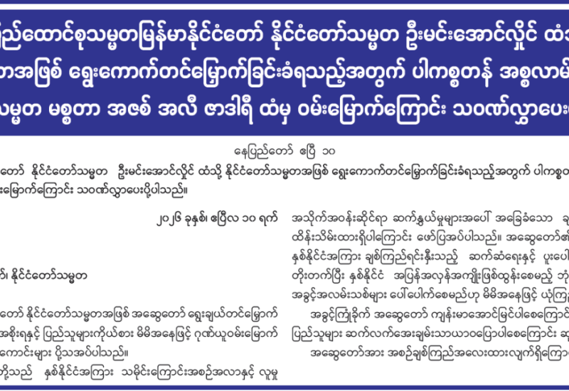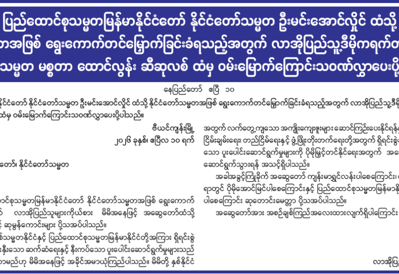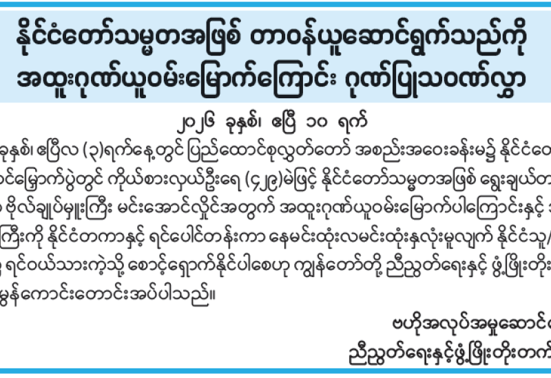 နိုင်ငံတော်သမ္မတအဖြစ် တာဝန်ယူဆောင်ရွက်သည်ကို အထူးဂုဏ်ယူဝမ်းမြောက်ကြောင်း ဂုဏ်ပြုသဝဏ်လွှာ