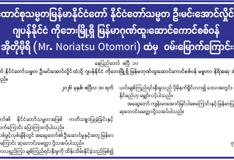 ပြည်ထောင်စုသမ္မတမြန်မာနိုင်ငံတော် နိုင်ငံတော်သမ္မတ ဦးမင်းအောင်လှိုင် ထံသို့ ဂျပန်နိုင်ငံ ကိုဘေးမြို့ရှိ မြန်မာဂုဏ်ထူးဆောင်ကောင်စစ်ဝန် မစ္စတာ နိုရိအဆု အိုတိုမိုရိ (Mr. Noriatsu Otomori) ထံမှ ဝမ်းမြောက်ကြောင်းသဝဏ်လွှာပေးပို့