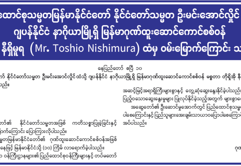 ပြည်ထောင်စုသမ္မတမြန်မာနိုင်ငံတော် နိုင်ငံတော်သမ္မတ ဦးမင်းအောင်လှိုင် ထံသို့ ဂျပန်နိုင်ငံ နာဂိုယာမြို့ရှိ မြန်မာဂုဏ်ထူးဆောင်ကောင်စစ်ဝန် မစ္စတာ တိုရှိအို နီရှိမူရ (Mr. Toshio Nishimura) ထံမှ ဝမ်းမြောက်ကြောင်း သဝဏ်လွှာပေးပို့