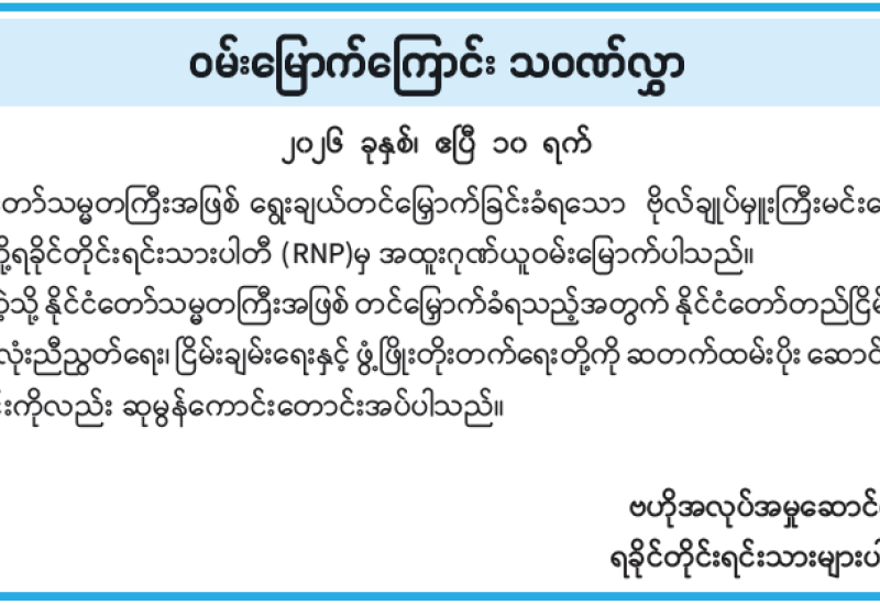 ပြည်ထောင်စုလွှတ်တော်နာယကကြီးနှင့်တကွ ပြည်ထောင်စုလွှတ်တော်ကိုယ်စားလှယ်များ၊ ပြည်ထောင်စုအစိုးရအဖွဲ့ဝင်များ၊ ပြည်ထောင်စုအဆင့်အဖွဲ့အစည်းဝင်များ၊ တက်ရောက်လာကြတဲ့ နိုင်ငံအသီးသီးမှ ကိုယ်စားလှယ်တော်များ၊ မြန်မာနိုင်ငံအခြေစိုက် နိုင်ငံခြားသံရုံးများမှ သံအမတ်ကြီးများ၊ သံတမန်များ၊ တက်ရောက်လာကြသူများနဲ့ မြန်မာနိုင်ငံသူ နိုင်ငံသားများအားလုံး ကိုယ်စိတ်နှစ်ဖြာကျန်းမာချမ်းသာပြီး ကျက်သရေမင်္ဂလာအပေါင်းနဲ့ ပြည့်စုံကြပါစေလို့ ဦးစွာ ဆုမွန်ကောင်းတောင်းရင်း နှုတ်ခွန်းဆက်သအပ်ပါတယ်။