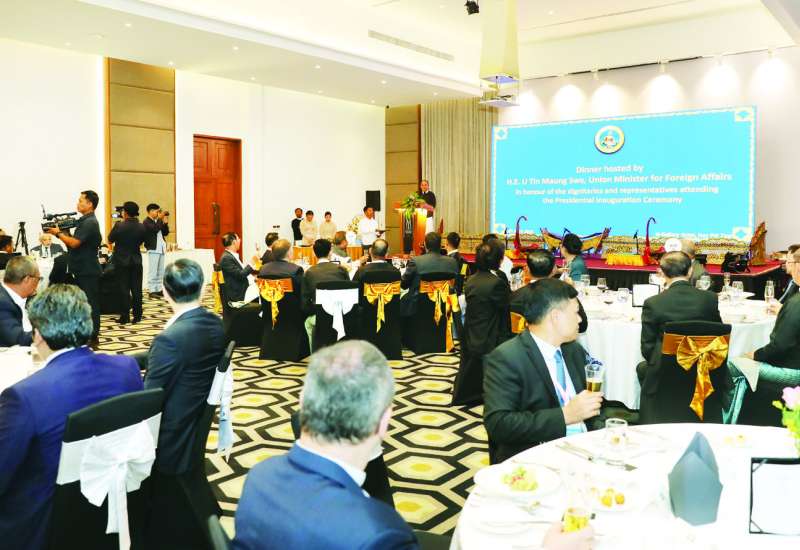 ပြည်ထောင်စုသမ္မတမြန်မာနိုင်ငံတော် နိုင်ငံတော်သမ္မတအသစ် ကတိသစ္စာပြုခြင်းနှင့် စတင်တာဝန်ယူခြင်း အခမ်းအနားသို့ တက်ရောက်လာကြသည့် နိုင်ငံအသီးသီးမှအစိုးရများ၏အဆင့်မြင့် ကိုယ်စားလှယ်များ၊ ဧည့်သည်တော်များနှင့် သံအမတ်ကြီးများအား နိုင်ငံခြားရေးဝန်ကြီးဌာန ပြည်ထောင်စုဝန်ကြီး ဦးတင်မောင်ဆွေက ယနေ့ညနေပိုင်းတွင် နေပြည်တော်ရှိ M Gallery ဟိုတယ်၌ ညစာစားပွဲဖြင့် တည်ခင်းဧည့်ခံသည်။