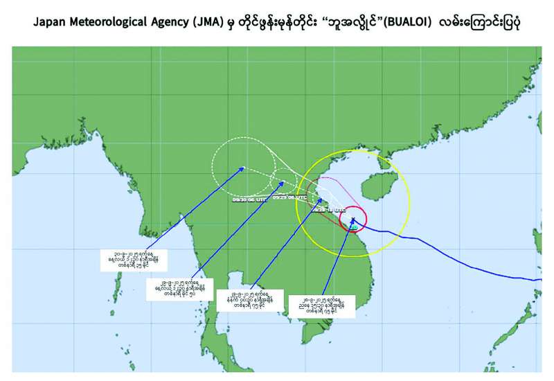 ယနေ့ညနေ ၃ နာရီခွဲတိုင်းထွာချက်များအရ တောင်တရုတ်ပင်လယ်ပြင်တွင်ဖြစ်ပေါ်နေသော တိုင်ဖွန်းမုန်တိုင်း “ဘူအလွိုင်” သည် အနောက်-အနောက်မြောက်ဘက်သို့ ရွေ့လျားလျက်ရှိပြီး ဗီယက်နမ်နိုင်ငံ ဒါနန်းမြို့၏ မြောက်-အရှေ့မြောက်ဘက်ရေမိုင် ၅၀ ခန့်နှင့် ဗင့်မြို့၏ အရှေ့တောင်ဘက် ရေမိုင် ၁၇၀ ခန့်အကွာ ပင်လယ်ပြင်ကို ဗဟိုပြုနေသည်။