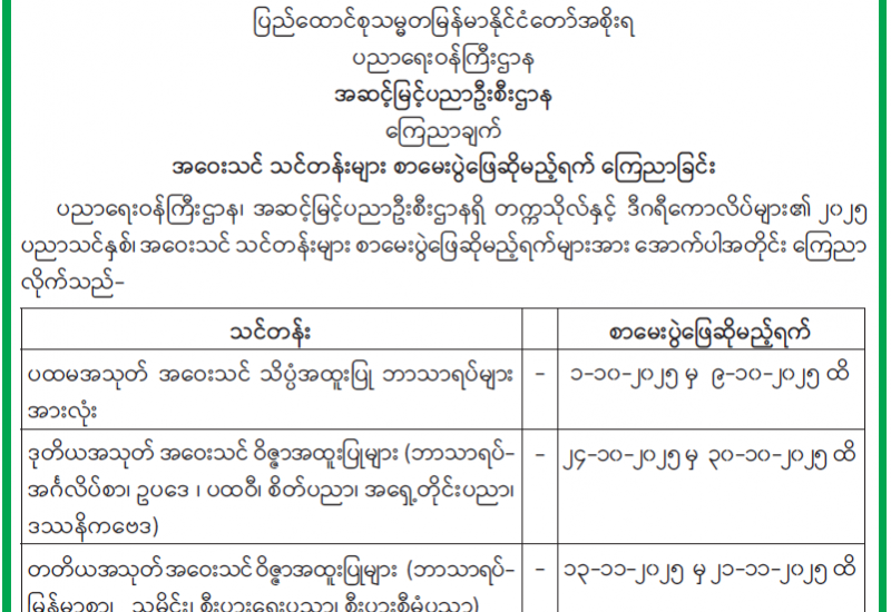 အဝေးသင် သင်တန်းများ စာမေးပွဲဖြေဆိုမည့်ရက် ကြေညာခြင်း