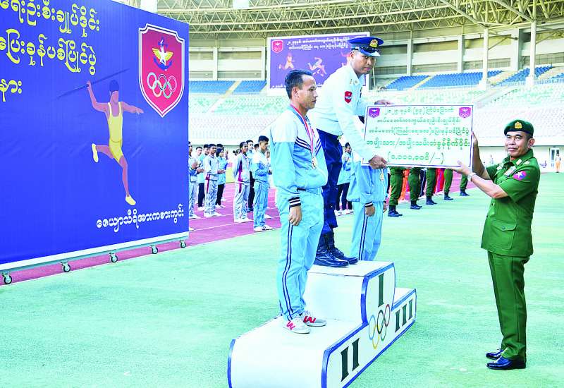 တပ်မတော်ကာကွယ်ရေးဦးစီးချုပ်ဒိုင်း တပ်မတော် (ကြည်း၊ ရေ၊ လေ) ပြေး၊ ခုန်၊ ပစ်ပြိုင်ပွဲ ဗိုလ်လုပွဲနှင့် ဆုပေးပွဲကို ယနေ့ညနေပိုင်းတွင် နေပြည်တော်ကောင်စီနယ်မြေ ဇေယျာသီရိတပ်မတော်အားကစားကွင်း၌ ပြုလုပ်ရာ နိုင်ငံတော်လုံခြုံရေးနှင့်အေးချမ်းသာယာရေးကော်မရှင်ဥက္ကဋ္ဌ တပ်မတော်ကာကွယ်ရေးဦးစီးချုပ် ဗိုလ်ချုပ်မှူးကြီး မင်းအောင်လှိုင်ကိုယ်စား တပ်မတော်အားကစားနှင့်ကာယပညာအုပ်ချုပ်ရေးအဖွဲ့ဥက္ကဋ္ဌ စစ်ရေးချုပ် ဒုတိယဗိုလ်ချုပ်ကြီး ဖုန်းမြတ် တက်ရောက်သည်။