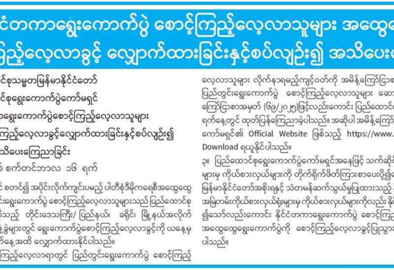 ပြည်တွင်းနှင့် နိုင်ငံတကာရွေးကောက်ပွဲ စောင့်ကြည့်လေ့လာသူများ အထွေထွေရွေးကောက်ပွဲ စောင့်ကြည့်လေ့လာခွင့် လျှောက်ထားခြင်းနှင့်စပ်လျဉ်း၍ အသိပေးကြေညာ
