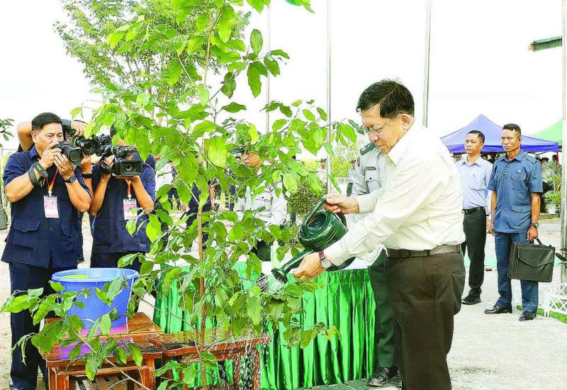 ပြည်ထောင်စုနယ်မြေ၊ နေပြည်တော်၊ ၂၀၂၅ ခုနှစ်၊ တတိယအကြိမ် မိုးရာသီသစ်ပင်စိုက်ပျိုးပွဲအခမ်းအနားကို ယနေ့နံနက်ပိုင်းတွင် ပြည်ထောင်စုနယ်မြေ နေပြည်တော်၊ ဒက္ခိဏသီရိမြို့နယ်၊ မာရဝိဇယဗုဒ္ဓရုပ်ပွားတော်မြတ်ကြီး ပရိဝုဏ်တော်အနီး၌ ကျင်းပရာ ပြည်ထောင်စုသမ္မတမြန်မာနိုင်ငံတော် ယာယီသမ္မတ နိုင်ငံတော်လုံခြုံရေးနှင့်အေးချမ်းသာယာရေးကော်မရှင်ဥက္ကဋ္ဌ ဗိုလ်ချုပ်မှူးကြီး မင်းအောင်လှိုင် တက်ရောက်၍ ခရေပျိုးပင်ကို ဦးဆောင်စိုက်ပျိုးပေးသည်။