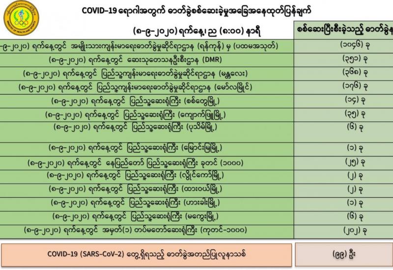 ၁။ (၈-၉ -၂၀၂၀) ရက်နေ့အတွက် COVID-19 ရောဂါ ဓာတ်ခွဲစစ်ဆေးရာတွင် -