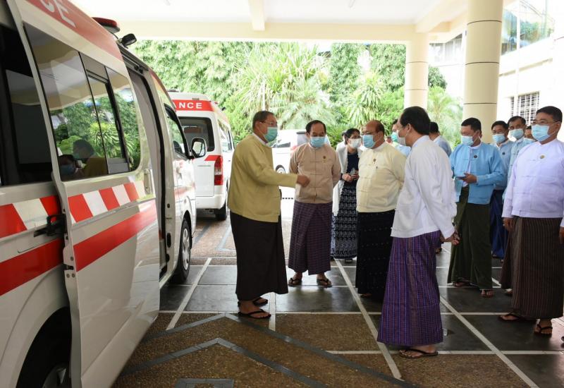 စီမံကိန်း၊ ဘဏ္ဍာရေး နှင့် စက်မှုဝန်ကြီးဌာနမှ ကျန်းမာရေးနှင့်အားကစားဝန်ကြီးဌာနက COVID-19 Economic Relief Plan ဖြင့် ဝယ်ယူသော လူနာတင်ယာဉ် (၁၂) စီးအနက် ပထမအသုတ် (၄) စီးအား လွှဲပြောင်း ပေးအပ်ခြင်းအခမ်းအနားကို ယနေ့တွင် နေပြည်တော်ရှိ ကျန်းမာရေးနှင့်အားကစားဝန်ကြီးဌာန ၌ ကျင်းပသည်။