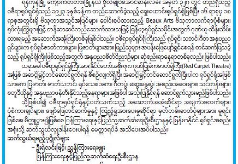 ရန်ကုန်မြို့ ကျောက်တံတားမြို့နယ် ဗိုလ်ချုပ်အောင်ဆန်းလမ်း အမှတ် ၃၂၇ တွင် တည်ရှိသည့် ဝဇီရာရုပ်ရှင်ရုံသည် ၁၉၂၃ ခုနှစ်ခန့်က တည်ဆောက်ခဲ့သည့် ရှေးဟောင်းရုပ်ရှင်ရုံဖြစ်ပြီး ၁၆ ရာစုမှ ၁၈ ရာစုအတွင်းရှိ ဗိသုကာအသွင်အပြင်များ ပေါင်းစပ်ထားသည့် Beaux Arts ဗိသုကာလက်ရာပုံစံများ၊ ရုပ်လုံးကြွများဖြင့် တန်ဆာဆင်တည်ဆောက်ထားသဖြင့် မြန်မာ့ရုပ်ရှင်သမိုင်းအတွက် ဂုဏ်ယူထိန်းသိမ်းထားရမည့် အဆောက်အအုံကြီးတစ်ခုဖြစ်ပါသည်။ ဝဇီရာရုပ်ရှင်ရုံကြီးသည် ရုပ်ရှင်၊ သဘင်၊ ဂီတအနုပညာရှင်များက ရုပ်ရှင်ဇာတ်ကားများ၊ ပြဇာတ်များအား ပြည်သူများ အပန်းဖြေပျော်ရွှင်စေရန် တင်ဆက်ပြသခဲ့သည့် ရုပ်ရှင်ရုံကြီးဖြစ်သည့်အတွက် အနုပညာစိတ်ဝိညာဉ်များ ဆုံစည်းရာနေရာတစ်ခုလည်းဖြစ်ပါသည်။