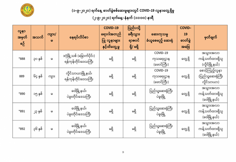 ၁။ (၂-၉ -၂၀၂၀) ရက်နေ့အတွက် COVID-19 ရောဂါ ဓာတ်ခွဲစစ်ဆေးရာတွင် -