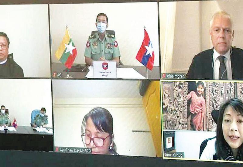 အရွယ်မရောက်သေးသူ ကလေးသူငယ်များအား စစ်မှုထမ်းခြင်းမှ ကာကွယ်တားဆီးရေးကိစ္စနှင့်စပ်လျဉ်း၍ ယမန်နေ့နံနက်ပိုင်းက Video Conference ဖြင့်ကျင်းပရာ ကာကွယ်ရေးဦးစီးချုပ်ရုံး (ကြည်း)မှ စစ်ရေးချုပ် ဒုတိယဗိုလ်ချုပ်ကြီး မျိုးဇော်သိန်းနှင့် တပ်မတော်အရာရှိကြီးများ၊ CTFMR ပူးတွဲဥက္ကဋ္ဌများ ဖြစ်ကြသည့် မြန်မာနိုင်ငံဆိုင်ရာကုလသမဂ္ဂဌာနေညှိနှိုင်းရေးမှူး Mr. Ola Almgren၊ မြန်မာနိုင်ငံဆိုင်ရာ ယူနီဆက် ကိုယ်စားလှယ် Ms. June Kunugi နှင့် တာဝန်ရှိသူများ တက်ရောက်ကြသည်။