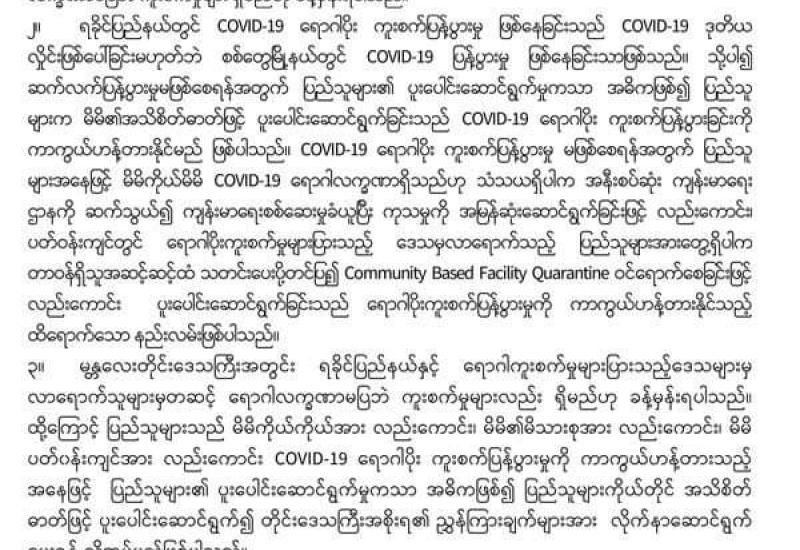 မန္တလးတိုင်းဒေသကြီးအတွင်း ရခိုင်ပြည်နယ်နှင့် ရောဂါကူးစက်မှုများပြားသည့် ဒေသများမှ လာရောက်သူများမှ တစ်ဆင့် ရောဂါလက္ခဏာမပြဘဲ ကူးစက်များရှိမည်ဟု ခန့်မှန်းထားသောကြောင့် COVID-19 ရောဂါ ကာကွယ်ရေး အတွက် ပြည်သူများပူးပေါင်းဆောင်ရွက်ပေးရန် တိုင်းဒေသကြီးအစိုးရက တိုက်တွန်းနှိုးဆော်ထားသည်။